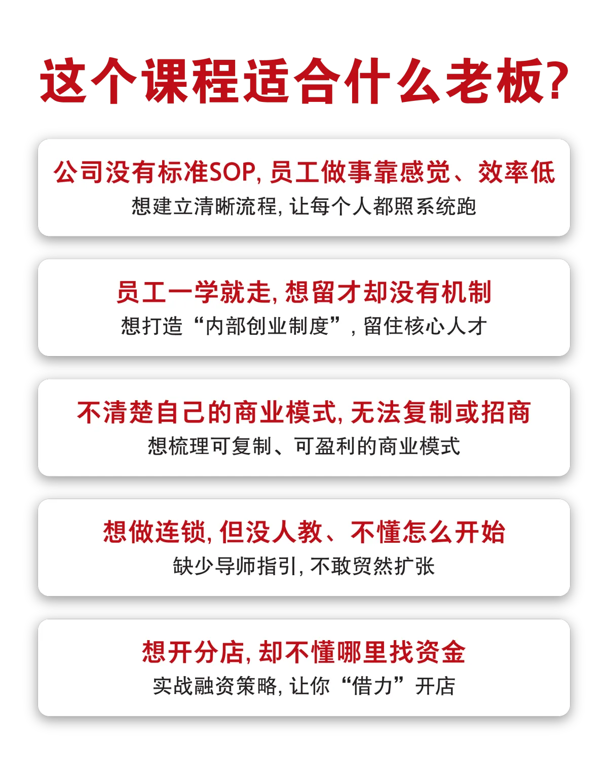 这是因为没有标准化。课程会教你如何建立【SOP + 留才制度】,打造“复制型团队”。