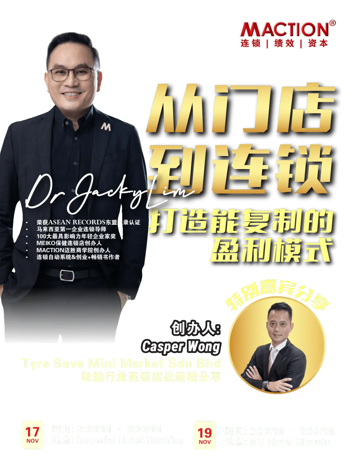 20年前,Jacky 只是个每天从早忙到晚的小老板,员工不到3人,每个月光是房租和薪资就压得他喘不过气。那时的他,连“放手”都不敢想,怕店没人看,业绩会掉。 直到有一次,他因为过劳进了医院,才意识到:“我不能一辈子都靠自己拼命。” 他开始研究系统化经营,四处请教连锁专家,从失败中不断复盘,终于打造出“可复制、能扩张、能放手”的连锁盈利系统。 短短几年,从一家店变成全国 10 多家分店,甚至帮助超过 300 家品牌,成功复制分店、突破瓶颈,走上连锁扩张之路! 今天的他,不再是一个孤军奋战的小老板,而是马来西亚首屈一指的企业连锁导师。他说:“企业能走多远,不靠你多拼,而靠你有没有方法。”